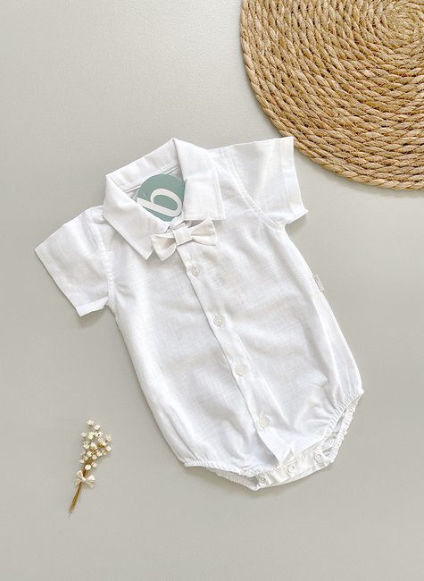 Body camisa manga curta Lucas com gravata removível branca. Elegância, conforto e versatilidade para o bebê em ocasiões especiais ou no dia a dia.
