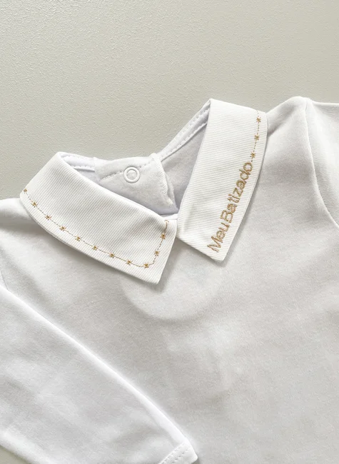 Detalhes: Gola, punhos e bordado “Meu Batizado” com asas de anjo bege