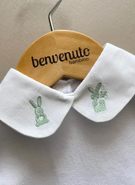 1. Gola bordada: O Body possui uma gola bordada com detalhes do coelhinho da Páscoa na cor verde. Esse detalhe traz um charme extra para a peça, deixando o bebê ainda mais fofo e encantador.