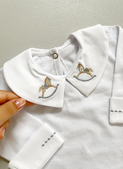 O body tem um bordado charmoso na gola e nos punhos, que acrescenta um toque especial à peça.