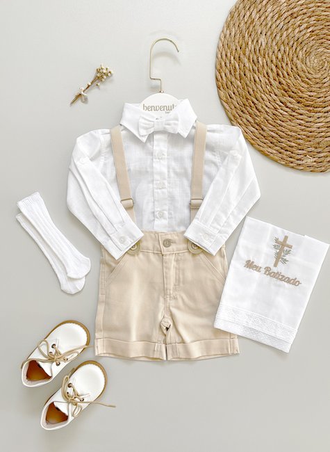 O conjunto masculino para batizado, com camisa 100% algodão, shorts com elastano, suspensório ajustável e gravata, garante liberdade de movimento sem abrir mão da sofisticação.