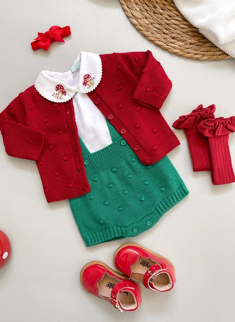 Composto por romper bloomer em tricot hipoalergênico, body bordado 100% algodão, casaco em tricot térmico, meias caneladas antialérgicas e sapatilha Manuela vermelha, este conjunto é ideal para quem busca um conjunto de roupa para bebê menina sofisticado e confortável.
