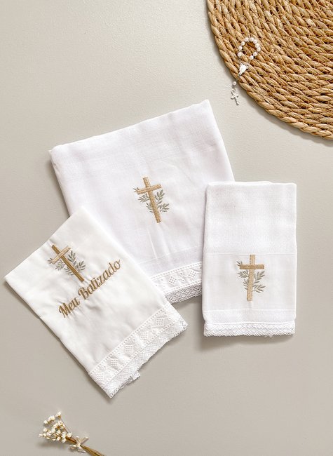 A Toalha com medidas de 27x 55cm, Fralda de boca medindo 38x38cm e a Fralda de ombro com 67x67cm, todas com design elegante e sofisticado, além do bordado encantador de Cruz e Folhas e o acabamento das bordas em renda, combinando com qualquer estilo de batizado. Acompanha um lindo terço dezena!