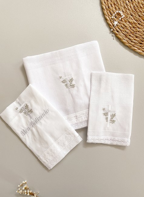 A Toalha com medidas de 27x 55cm, Fralda de boca medindo 38x38cm e a Fralda de ombro com 67x67cm, todas com design elegante e sofisticado, além do bordado encantador de Cruz e Folhas e o acabamento das bordas em renda, combinando com qualquer estilo de batizado. Acompanha um lindo terço dezena!