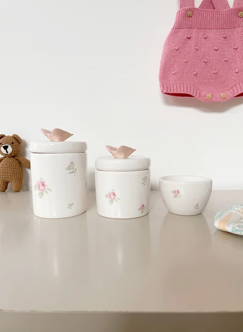 Os potes são feitos de cerâmica esmaltada, um material vitalício e de fácil higienização. No pote maior, você pode guardar algodão para a limpeza do bebê (os lenços umedecidos não são indicados diariamente nos primeiros meses).