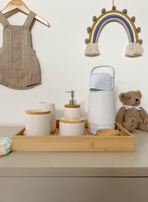 Composto por potes para algodão e cotonetes, saboneteira, porta utensílios, molhadeira de bambu, bandeja e garrafa térmica, este kit higiene completo para troca de fraldas é ideal para pais que buscam praticidade sem abrir mão do design.