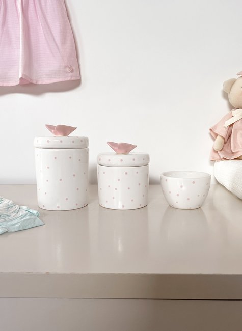 Praticidade e organização para a troca de fraldas. Os potes são feitos de cerâmica esmaltada, um material vitalício e de fácil higienização.