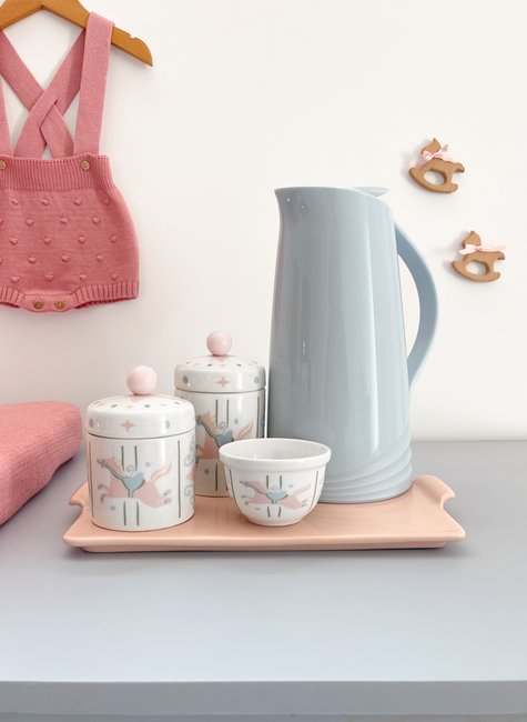 Organização completa: a bandeja em cerâmica (20x30cm) acomoda perfeitamente os potes e a garrafa térmica, mantendo tudo organizado e acessível.