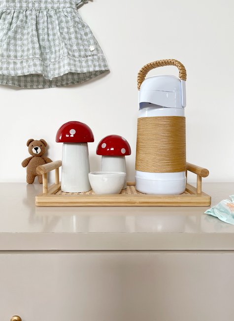 A bandeja de bambu mantém todos os itens centralizados, os potes em porcelana armazenam os produtos de higiene com segurança e a garrafa térmica garante água sempre na temperatura ideal para a limpeza do bebê.