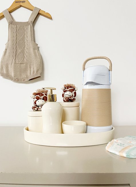 Pensado para atender às necessidades reais do dia a dia, o kit higiene Benvenuto auxilia diretamente no momento da troca de fraldas, tornando-o mais rápido e eficiente. O pote maior é ideal para armazenar algodão, recomendado para a limpeza delicada do bebê nos primeiros meses, quando o uso diário de lenços umedecidos não é indicado. O pote menor comporta cotonetes, muito utilizados na limpeza do coto umbilical nos primeiros dias. A molhadeira permite o uso de água morninha, especialmente quando combinada com a garrafa térmica inclusa, que conserva líquidos quentes ou frios por até 6 horas. A bandeja em cerâmica mantém todos os itens organizados e seguros, enquanto a saboneteira líquida é perfeita para o uso de álcool em gel, reforçando os cuidados com a higiene. Além disso, o reaproveitamento dos potes após a fase das trocas agrega ainda mais valor ao produto, tornando-o um investimento inteligente e versátil.