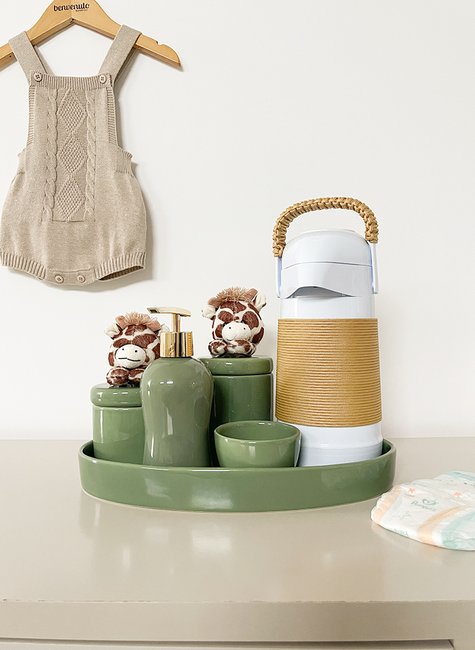 Pensado para atender às necessidades reais do dia a dia, o kit higiene Benvenuto auxilia diretamente no momento da troca de fraldas, tornando-o mais rápido e eficiente. O pote maior é ideal para armazenar algodão, recomendado para a limpeza delicada do bebê nos primeiros meses, quando o uso diário de lenços umedecidos não é indicado. O pote menor comporta cotonetes, muito utilizados na limpeza do coto umbilical nos primeiros dias. A molhadeira permite o uso de água morninha, especialmente quando combinada com a garrafa térmica inclusa, que conserva líquidos quentes ou frios por até 6 horas. A bandeja em cerâmica mantém todos os itens organizados e seguros, enquanto a saboneteira líquida é perfeita para o uso de álcool em gel, reforçando os cuidados com a higiene. Além disso, o reaproveitamento dos potes após a fase das trocas agrega ainda mais valor ao produto, tornando-o um investimento inteligente e versátil.