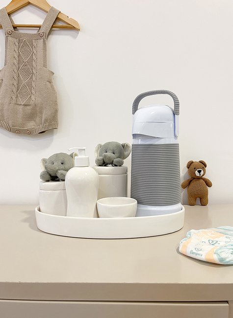 Pensado para atender às necessidades reais do dia a dia, o kit higiene Benvenuto auxilia diretamente no momento da troca de fraldas, tornando-o mais rápido e eficiente. O pote maior é ideal para armazenar algodão, recomendado para a limpeza delicada do bebê nos primeiros meses, quando o uso diário de lenços umedecidos não é indicado. O pote menor comporta cotonetes, muito utilizados na limpeza do coto umbilical nos primeiros dias. A molhadeira permite o uso de água morninha, especialmente quando combinada com a garrafa térmica inclusa, que conserva líquidos quentes ou frios por até 6 horas. A bandeja em cerâmica mantém todos os itens organizados e seguros, enquanto a saboneteira líquida é perfeita para o uso de álcool em gel, reforçando os cuidados com a higiene. Além disso, o reaproveitamento dos potes após a fase das trocas agrega ainda mais valor ao produto, tornando-o um investimento inteligente e versátil.