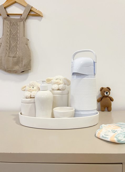 Pensado para atender às necessidades reais do dia a dia, o kit higiene Benvenuto auxilia diretamente no momento da troca de fraldas, tornando-o mais rápido e eficiente. O pote maior é ideal para armazenar algodão, recomendado para a limpeza delicada do bebê nos primeiros meses, quando o uso diário de lenços umedecidos não é indicado. O pote menor comporta cotonetes, muito utilizados na limpeza do coto umbilical nos primeiros dias. A molhadeira permite o uso de água morninha, especialmente quando combinada com a garrafa térmica inclusa, que conserva líquidos quentes ou frios por até 6 horas. A bandeja em cerâmica mantém todos os itens organizados e seguros, enquanto a saboneteira líquida é perfeita para o uso de álcool em gel, reforçando os cuidados com a higiene. Além disso, o reaproveitamento dos potes após a fase das trocas agrega ainda mais valor ao produto, tornando-o um investimento inteligente e versátil.