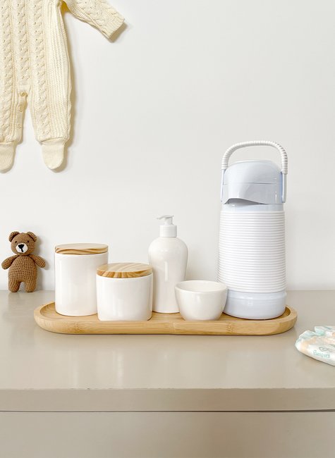 E a bandeja de bambu com 16x44cm, é essencial para manter tudo organizado, proporcionando praticidade e agilidade no momento das trocas do bebê.