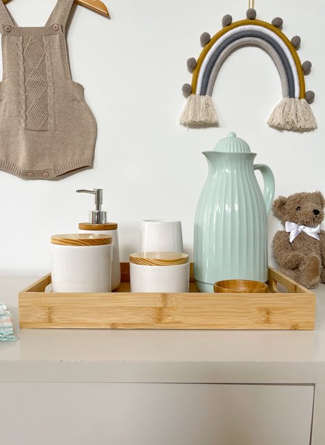 Ideal para trocadores e quartos infantis, o conjunto reúne itens essenciais como garrafa térmica para kit higiene bebê, kit higiene em cerâmica esmaltada e bandeja organizadora em bambu com palha natural, formando uma solução funcional e elegante para os primeiros meses do bebê.
