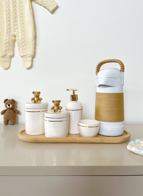 E a molhadeira para a água (de preferência morninha, por isso a garrafa térmica) que usamos para molhar o algodão e fazer a limpeza. Para complementar o seu kit higiene uma bandeja que deixa tudo mais organizado e seguro. E a saboneteira líquida para o uso hoje do tão importante álcool em gel.
