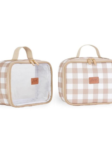O kit de necessaire ou organizador Vichy é composto por duas necessaires, sendo uma térmica com forro emborrachado e impermeável, perfeita para armazenar alimentos. Já a outra necessaire possui um prático visor transparente, que facilita a identificação rápida dos itens armazenados. Confeccionadas em poliéster com estampa xadrez, com medida 23x8x17cm, com detalhes do metal em banho de ouro e acabamento externo em sintético, trazendo durabilidade e resistência, além de elegância e sofisticação.