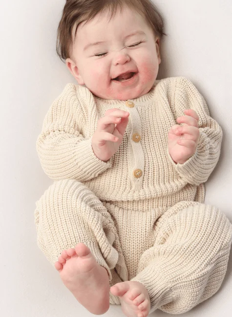 Confeccionado em tricot de linha mista premium (50% acrílico / 50% algodão), o macacão oferece uma série de benefícios que atendem às necessidades da pele sensível do bebê: