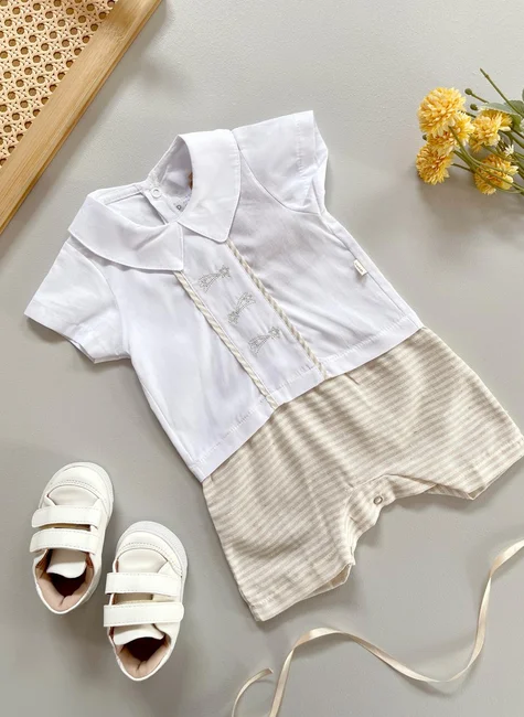 Macacão para menino Cometa Baby Apollo em tricoline 100% algodão: conforto e estilo para os primeiros momentos. Desenvolvido em tecido tricoline 100% algodão, oferece toque suave e alta respirabilidade, ideal para a pele delicada do bebê. O design une a sofisticação da camisa branca com bordados de cometas e a praticidade da parte de baixo em listras bege, proporcionando elegância sem abrir mão do conforto.