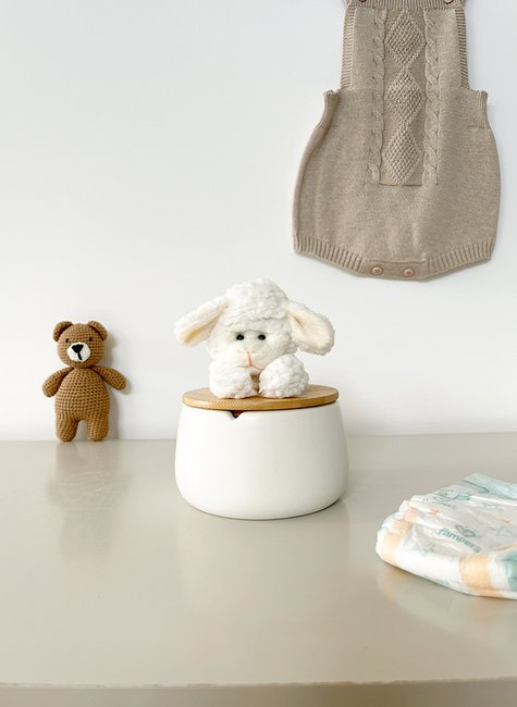 Desenvolvido especialmente para compor kits de higiene infantil, o produto combina porta algodão de cerâmica, tampa de bambu natural e acabamento em pelúcia antialérgica com selo Inmetro, garantindo charme e proteção para ambientes infantis.