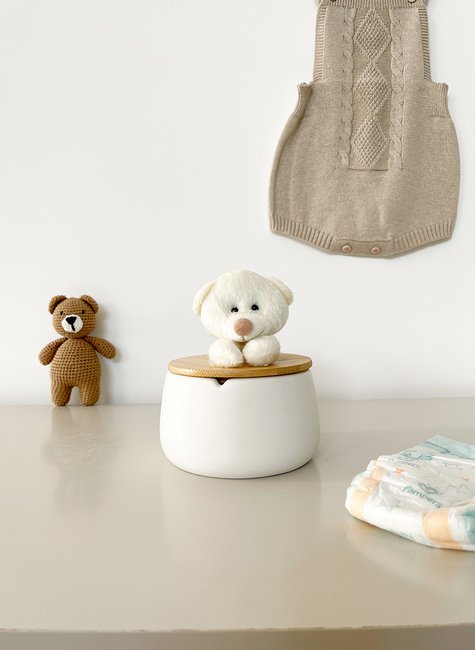 Desenvolvido especialmente para compor kits de higiene infantil, o produto combina porta algodão de cerâmica, tampa de bambu natural e acabamento em pelúcia antialérgica com selo Inmetro, garantindo charme e proteção para ambientes infantis.