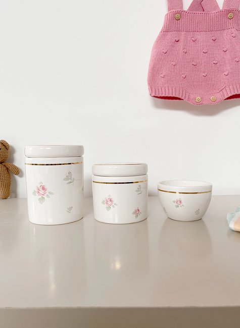 Conjunto com 3 potes de cerâmica esmaltada: Este kit inclui dois potes de tamanhos diferentes , ideais para armazenar algodão, cotonetes, pomadas e outros produtos de higiene do bebê. Além dos potes, este kit também inclui uma molhadeira para água morna, perfeita para facilitar as trocas de fraldas do seu bebê.