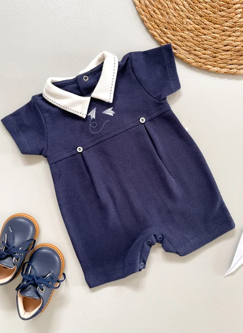 Este macacão curto com gola destaca-se pelo bordado delicado e design clássico, sendo uma peça-chave no guarda-roupa infantil.