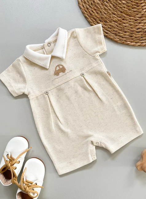 Este macacão curto com gola destaca-se pelo bordado delicado e design clássico, sendo uma peça-chave no guarda-roupa infantil.