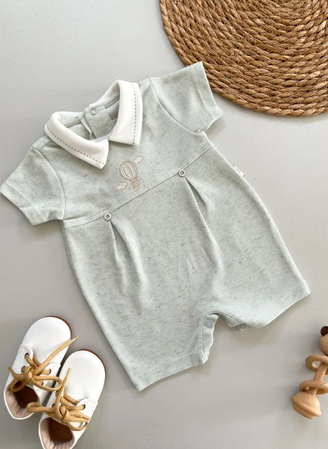 Este macacão curto com gola destaca-se pelo bordado delicado e design clássico, sendo uma peça-chave no guarda-roupa infantil.