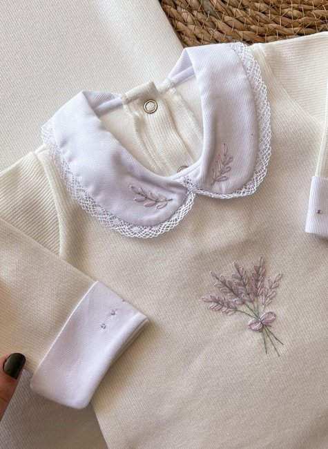 A Saída maternidade tricotada 100% algodão, é composta por 2 peças na cor Off White: por um macacão com bordado feito à mão de Lavanda, com gola e punhos em fustão e acabamento de renda, a abertura é feita por botões de pressão nas costas e pernas. Já manta é do mesmo material e tonalidade do macacão, medindo 74x80cm, um item essencial no enxoval, sendo indicada para forrar, proteger e embalar. Disponível nos tamanhos RN (0 a 45 dias) e P (0 a 3 meses).