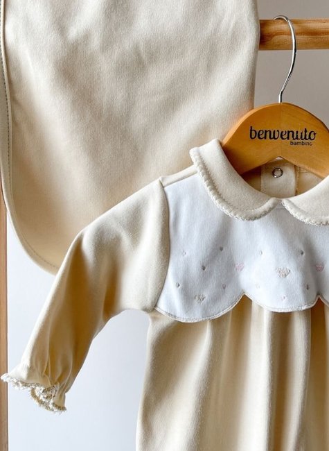 Macacão com Bordado e Babado na Manga: O macacão acompanha um lindo bordado delicado, além de babado nas mangas, que adiciona charme e um toque clássico à peça. Possui abertura nas costas e nas pernas com botões de pressão, o que facilita a troca de fraldas sem incomodar o bebê — um detalhe funcional que toda mamãe valoriza nos primeiros dias.