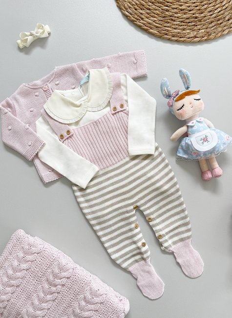 Composto por jardineira em tricot hipoalergênico, body com gola em algodão, manta em tricot rosa e casaco em tricot com textura de bolinhas, o conjunto oferece um visual sofisticado e acolhedor para o recém-nascido.