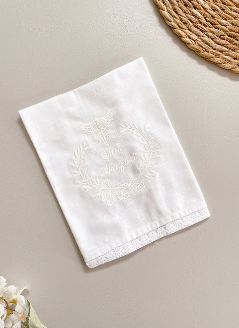Na cor branca, símbolo de pureza, fé e renovação espiritual, a toalha se destaca pelo bordado elegante e delicado, agregando valor emocional e estético à cerimônia.