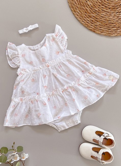 Vestido Body para Bebê Menina branco com tulipas Clara: charme e conforto em uma peça única para as pequenas. Confeccionado em tecido leve e macio, com toque suave e delicado, ideal para a pele sensível do bebê. O design exclusivo combina o body com vestido, garantindo praticidade na troca e liberdade para os movimentos. As tulipas em tom pastel trazem um toque de fofura e elegância, enquanto as mangas franzidas adicionam um detalhe encantador. Perfeito para ocasiões especiais ou para o dia a dia, oferece ajuste seguro com botões de pressão na parte inferior.