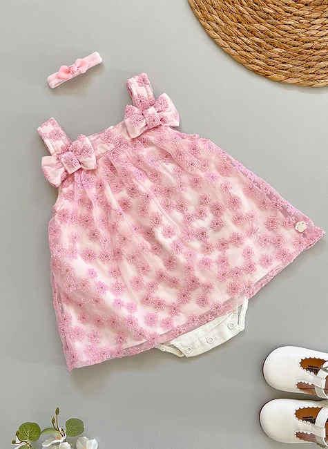 Vestido Body para Bebê Menina tule e bordado flores Amélia: elegância e conforto para momentos especiais. Confeccionado em 100% algodão com bordados florais em tons de rosa, este vestido une charme e suavidade para a pele sensível do bebê. O body integrado facilita a troca, garantindo praticidade sem abrir mão do estilo. Ideal para festas, casamentos e ensaios fotográficos, o modelo valoriza a feminilidade da sua pequena com detalhes únicos como laços bordados nas alças.