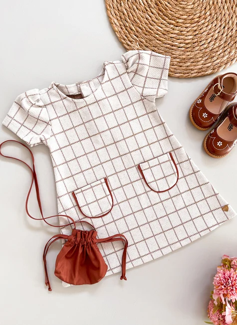 Com modelagem charmosa e acabamento refinado, o vestido apresenta manga curta com efeito bufante, dois bolsos frontais decorativos e estampa xadrez grid em tons bege e marrom, que trazem um visual clássico e atemporal.