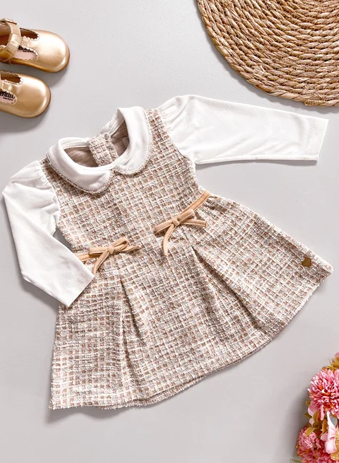 Ideal para quem procura vestido infantil em malha tweed com detalhes delicados, esse modelo se destaca pela combinação de текстuras e design atemporal.